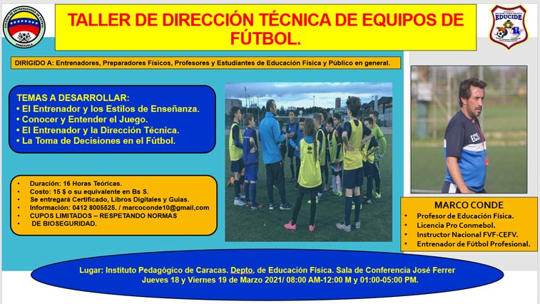 Prensa CNEFV.- En el mes de marzo se dará inicio en Caracas, a una serie de Talleres relacionados al Fútbol, de capacitación y actualización, organizados y avalados por el COLEGIO DE ENTRENADORES DE FÚTBOL DE VENEZUELA y EDUCIDE, cuyo objetivo primordial, es proporcionar al (los) Participante (s), las herramientas y conocimientos necesarias para su exitoso desempeño profesional en el Fútbol. Los contenidos de los distintos TALLERES que se ofrecerán, cumplen con los contenidos programáticos de los Cursos de Licencias PRO CONMEBOL Niveles B y A.