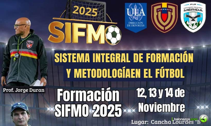 Ricardo Cabrera.- Bajo la coordinación de Pablo Emilio Zapata, se anuncia el Taller de Formación SIFMO 2025, un evento integral organizado por el Sistema Integral de Formación y Metodología para el Fútbol Moderno, y diseñado para elevar el nivel del fútbol regional, se llevará a cabo del 12 al 14 de noviembre en la Cancha Lourdes de la Universidad de los Andes, ubicada en la Avenida Don Tulio.