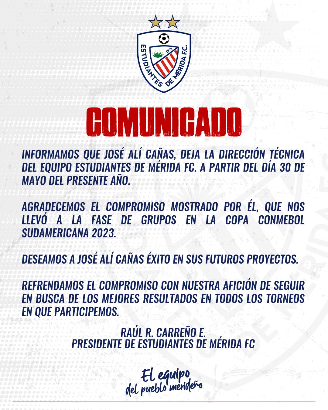 Víctor Sánchez Valdivieso @vesanchezv.- En comunicado oficial publicado este martes 30 de mayo, Estudiantes de Mérida anunció la salida del profesor José Ali Cañas de la conducción técnica del equipo que hace frente en simultáneo a la Liga FutVe de Primera División como la Copa Conmebol Sudamericana 2023.